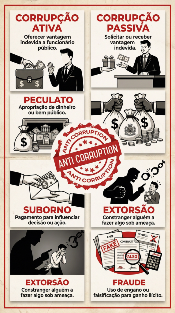 - Corrupção Ativa: Oferta, promessa ou entrega de um benefício (dinheiro, favores, etc.) a um funcionário público ou pessoa com poder para que realize ou omita um ato em benefício do corruptor.