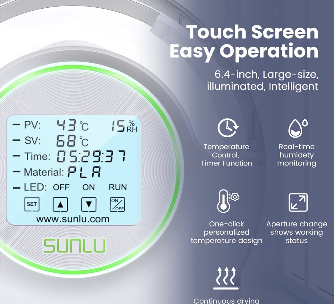 Secador SUNLU S2 Sensor integrado de detecção de umidade de alta precisão, exibindo umidade em tempo real dentro do secador de filamento S2. A troca do anel da lâmpada LED mostra o estado de funcionamento da caixa do secador, visualização do processo de secagem.
